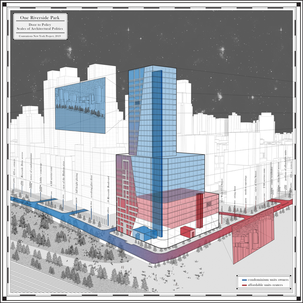 perspective / tiers of conflict between condominium owners (blue) and affordable housing renters (red); ranging across scales, tangibles and intangibles, architectural and systemicScaling up, the transition of material opacity to transparency maintains the politics of aesthetics. The façade translates from modestly-sized fenestrations for renters with views of 61st street, to full-height curtain walls viewing the Hudson for condo owners. Glass becomes a marker of the rich, while opaque materials apparently reek of the affordable. Additionally, this variance in materiality and the expression of the main and service doors strengthen the duality of ‘permanent’ owners and the ‘temporary’ renters.