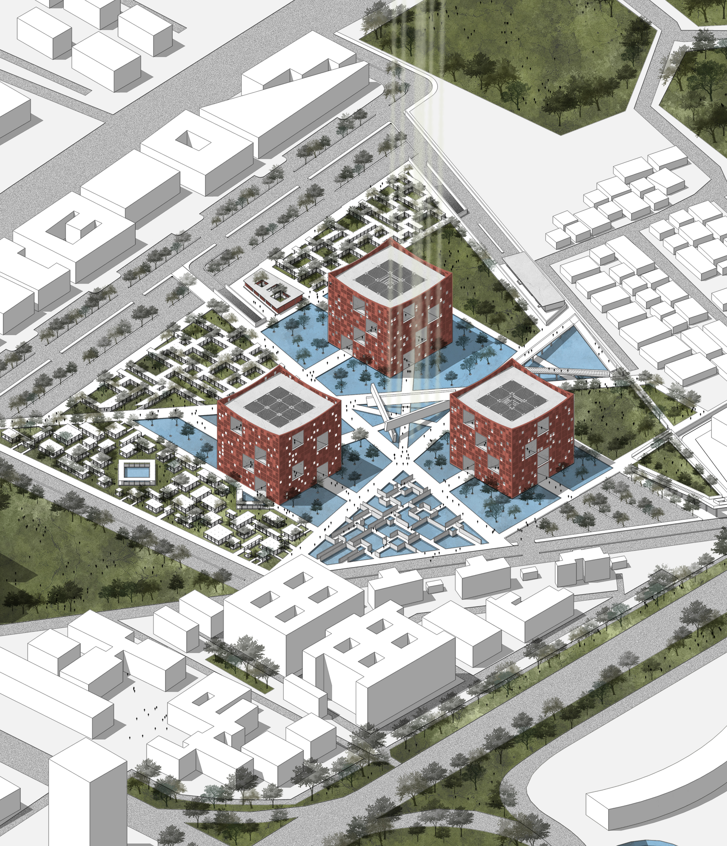 plan / site plan and model of urban revitalization The Light Well is the centerpiece of the site. It is the primary ‘manifestation’ of Exit Music and the confluence of the primary axes. Designed as a large pyre with intersecting slabs of highly polished stainless-steel surfaces, the pyre embodies all elements - water (through water bodies), air (with the air it encapsulates), earth (where it rests), metal (through materiality), aether (through people) and fire (six beams of light that flash in the night landscape). Water proves as the transition from land to blocks. Each block is accessible from any of the four cardinal directions through pathways chiseling across the water bodies. Water spiritually plays the cleansing agent, and architecturally as a heat trap that helps in passive cooling of the building from all directions. The outermost outline of all water bodies put together forms a distorted outline of an icosahedron.